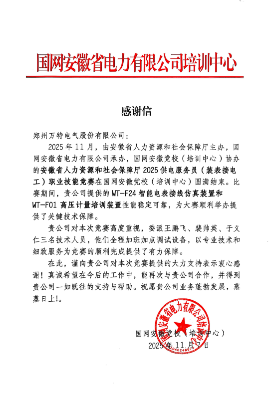 比赛期间,贵公司提供的WT-F24智能电表接线仿真装置和WT-F01高压计量培训装置性能稳定可靠,为大赛顺利举办提供了关键技术保障。
